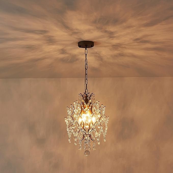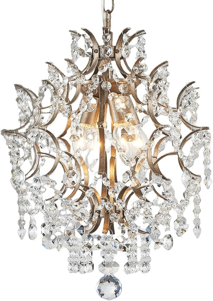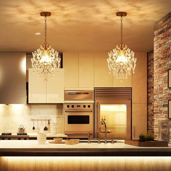 - To Be The Focal Point of Your Room- Full of hanging clear crystal droplets and teardrops create quite a spectacle when its six lights are illuminated. Even when not lit, its sparkling wedge silhouette is something to behold. Transform a traditional living room, dining room, kitchen island, bedroom into a glamorous showcase with this gold and crystal chandelier.
