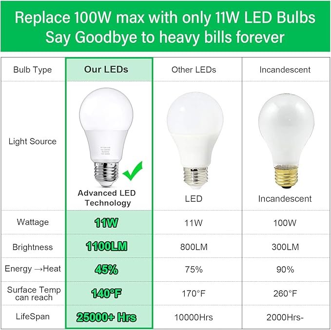 - Efficient 11W LED = 100W Replacement: Replace 100W incandescent light bulbs with just 11W of power and save electricity. These energy-efficient LED light bulbs also produce less heat, helping reduce cooling costs