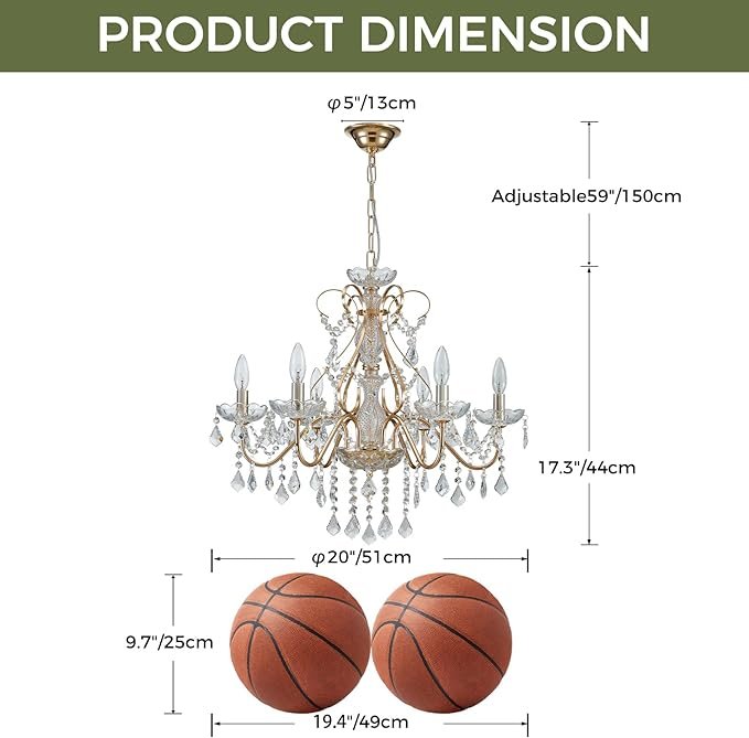 - 【Specifications】 Measuring 17.3\” in height and 20\” in width, this light fixture comes with an adjustable chain that extends up to 59\”. It requires 6x E12 bulbs to illuminate any room with a warm and welcoming glow.